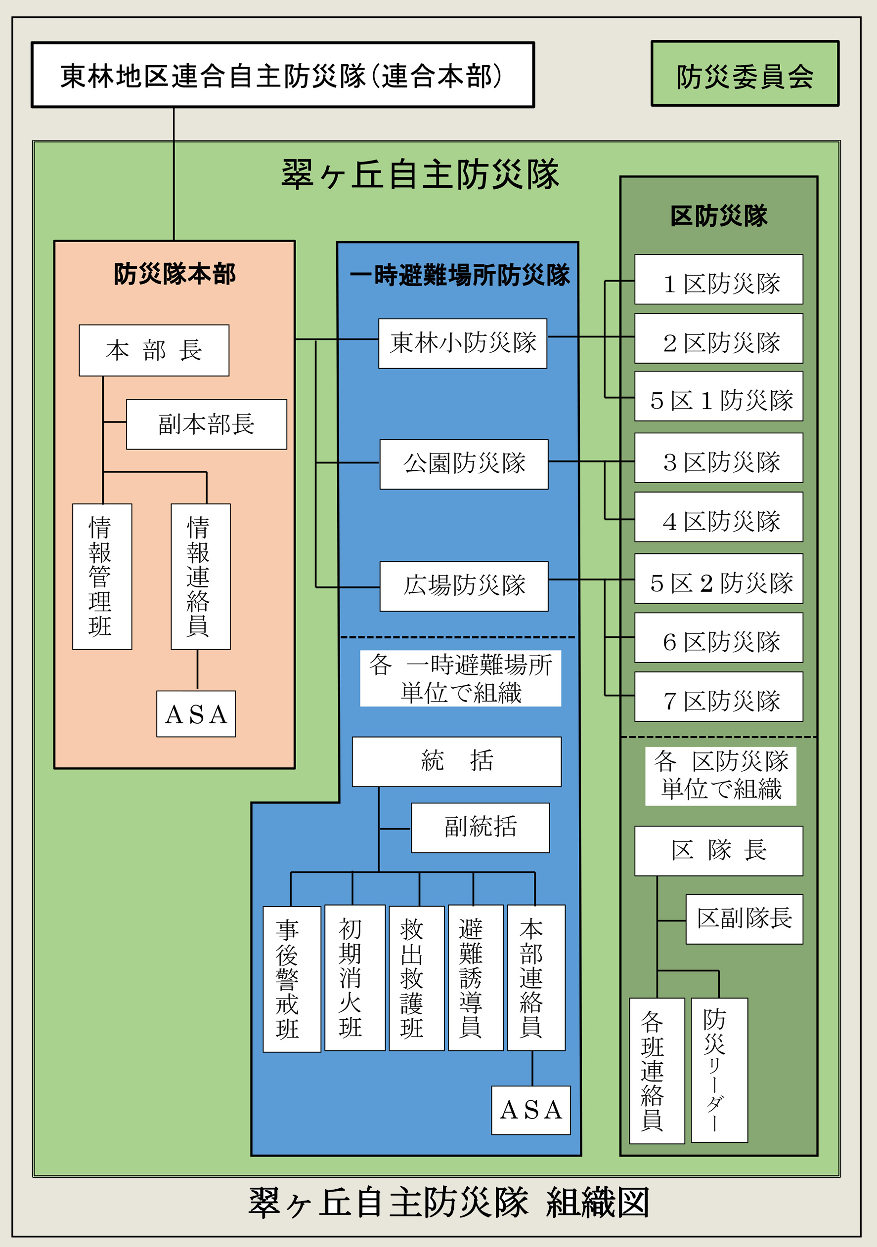 | 青年部 | 地域団体である「翠青会」を代表し、これを束ねる。自治会に対して、翠青会からの意見具申を行う。自治会各事業部会からの応援要請に協力する。 |