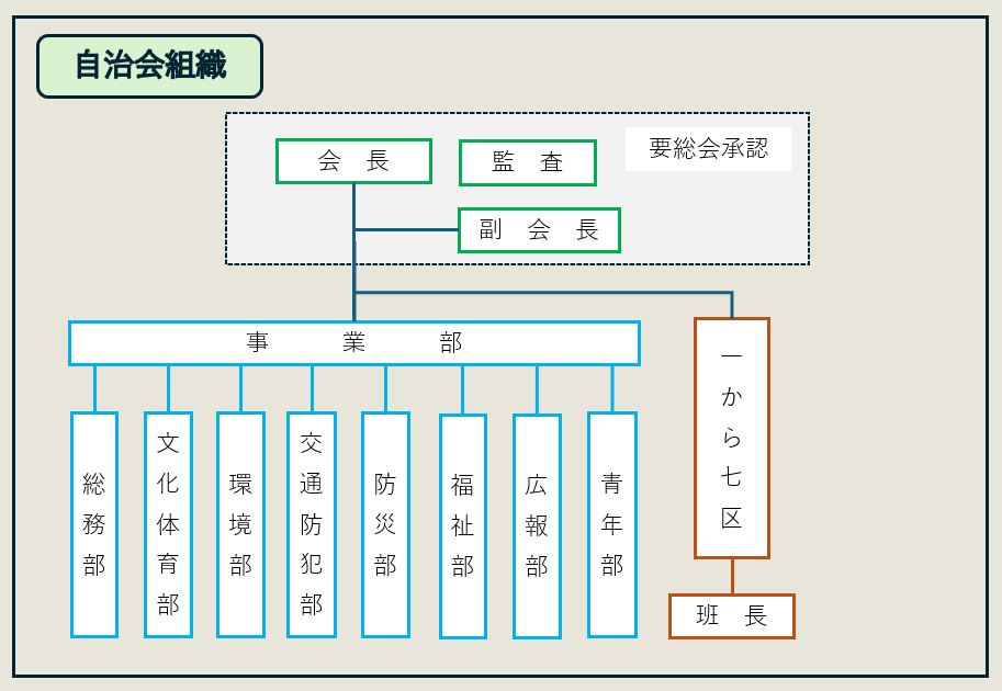 | 総務部 | 行政機関・各種団体との連絡協調、予算実算管理、自治会館の管理、他の部に属さない事項 | |